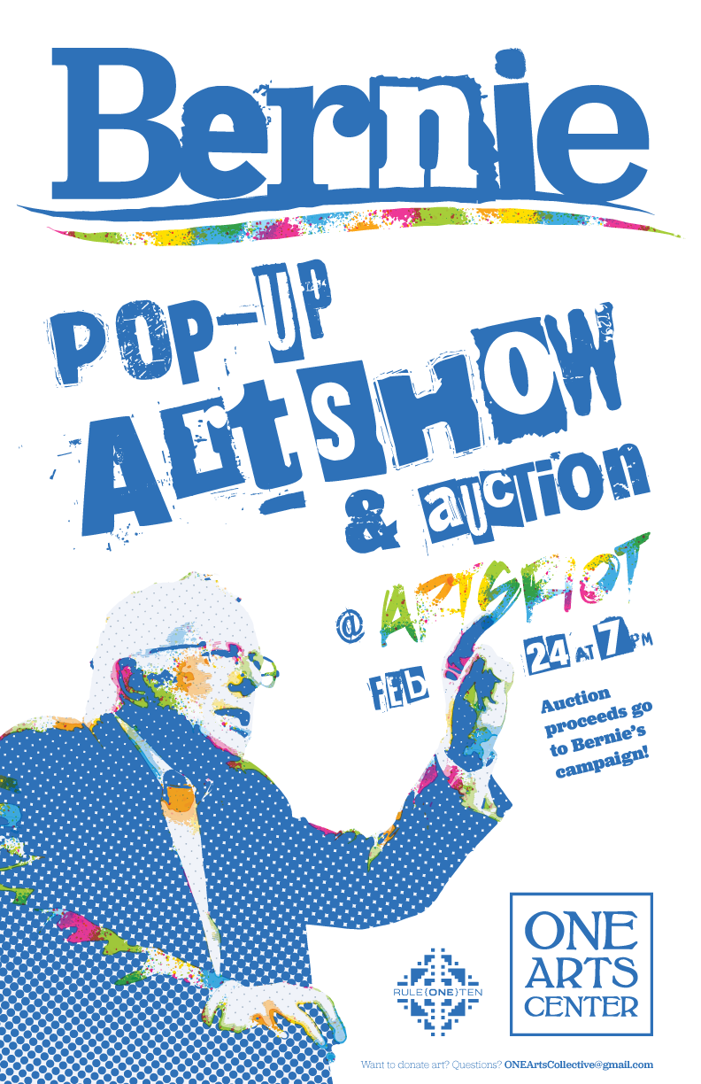 ONE Arts and ArtsRiot are thrilled to invite you to a Bernie Pop-Up Art Auction, Wednesday, February 24th at 7pm at ArtsRiot, 400 Pine Street, Burlington to support Bernie Sanders for President. Join us for a pre-auction art social, art auction to be followed by a Bernie Party! Art will be auctioned to the individuals who donates the most to the Bernie campaign on the spot. The entire auction is a donation to the campaign! If you are interested in helping out with any part of the event, submitting artwork, and/or a 30 second video clip of your support for Bernie Sanders contact oneartscollective@gmail.com. Or call Mellisa at 518.649.6464…..Let’s get together, get excited, and #FeeltheBern!!