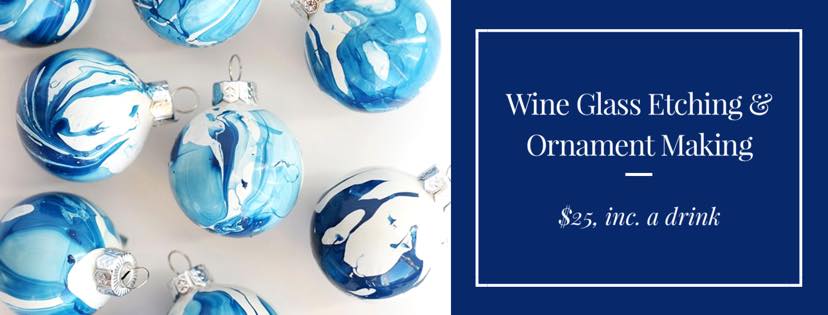 Join your friends in a giddy evening of etching wine glasses and holiday ornament making to give as presents or keep for yourself. Mellisa guides you through various techniques to make your creation, all with laughter and libations. Only $25, including a beer or glass of wine, 1-2 ornaments and a wine glass or bring a friend and buy in advance for a discount: 2 for $40.