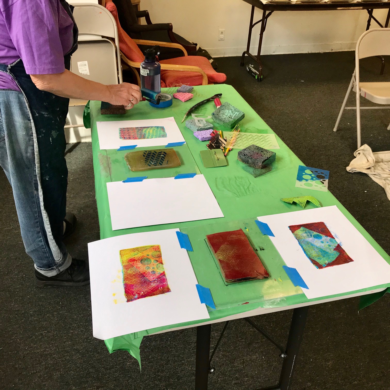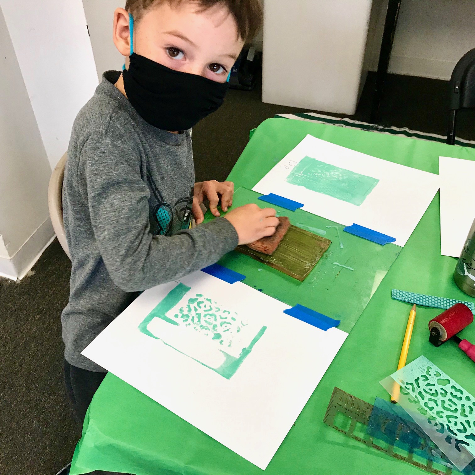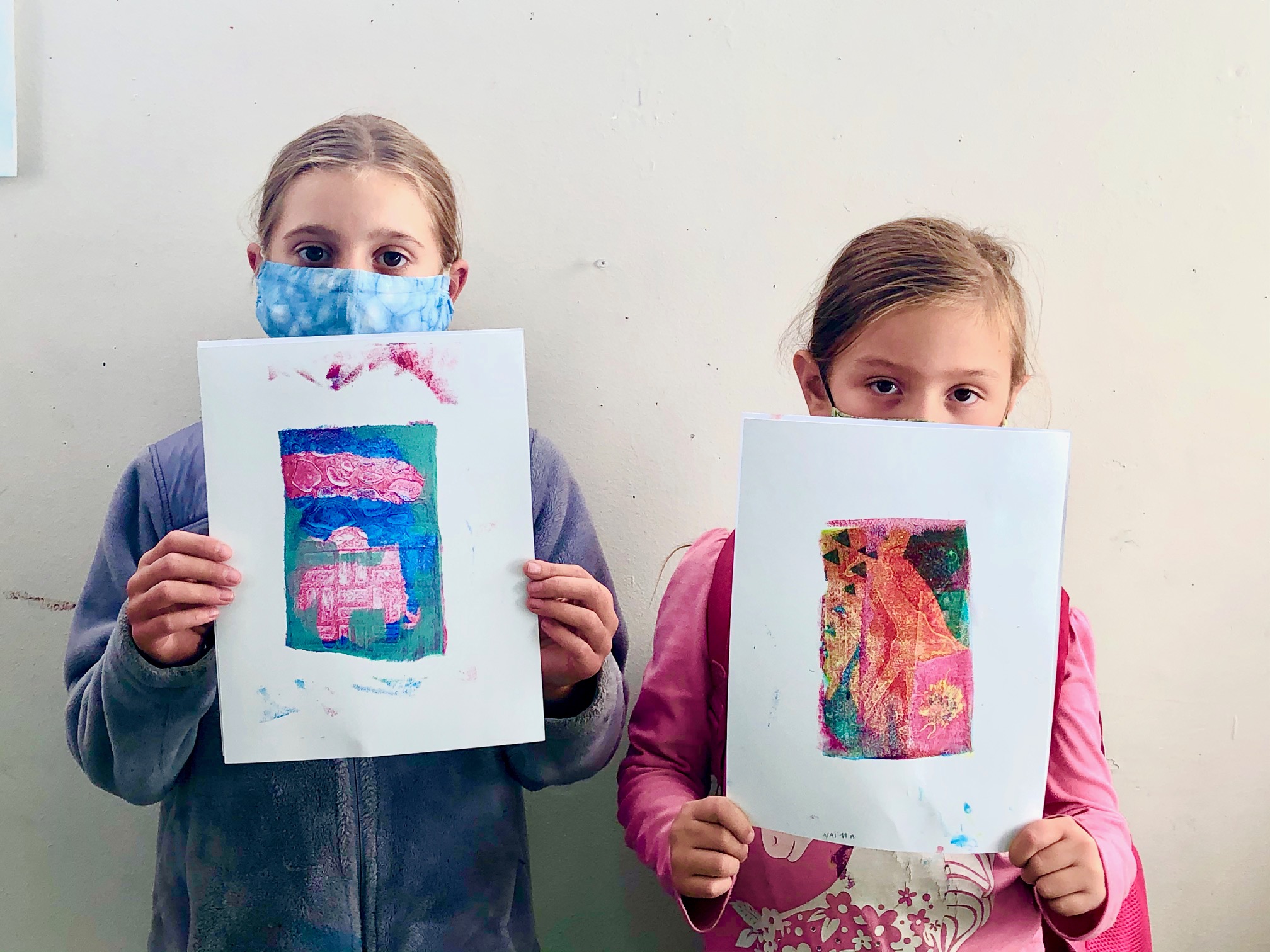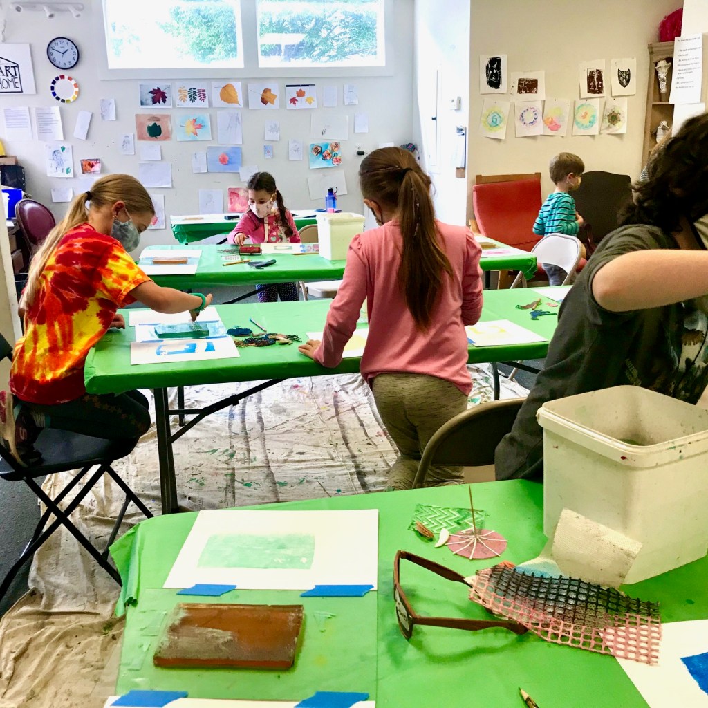 We had such a blast printmaking with guest artist Lyna Lou Nordstrom last Wednesday! We used a printing plate made from firm set gelatin. The process is pure aesthetic play: inking, adding different marks or textures, printing, wiping the plate clean and adding more to layer up the prints. We used some inks that were somewhat transparent so that the colors would mix when printing on top. SO MUCH FUN!