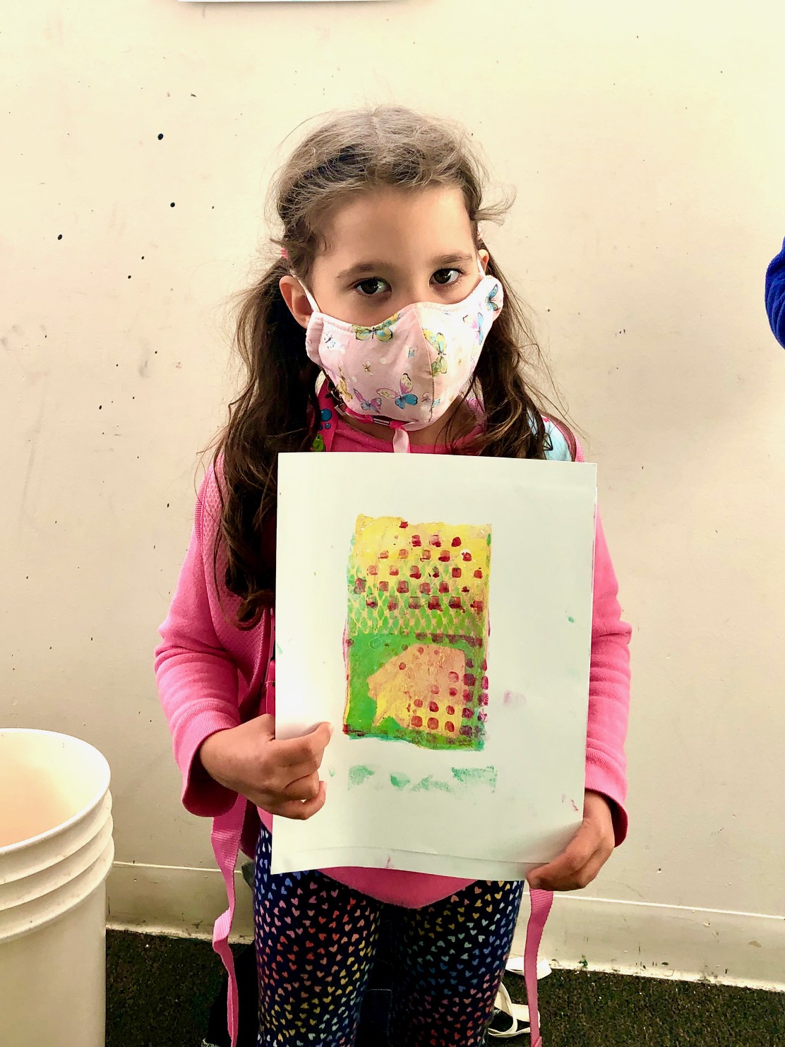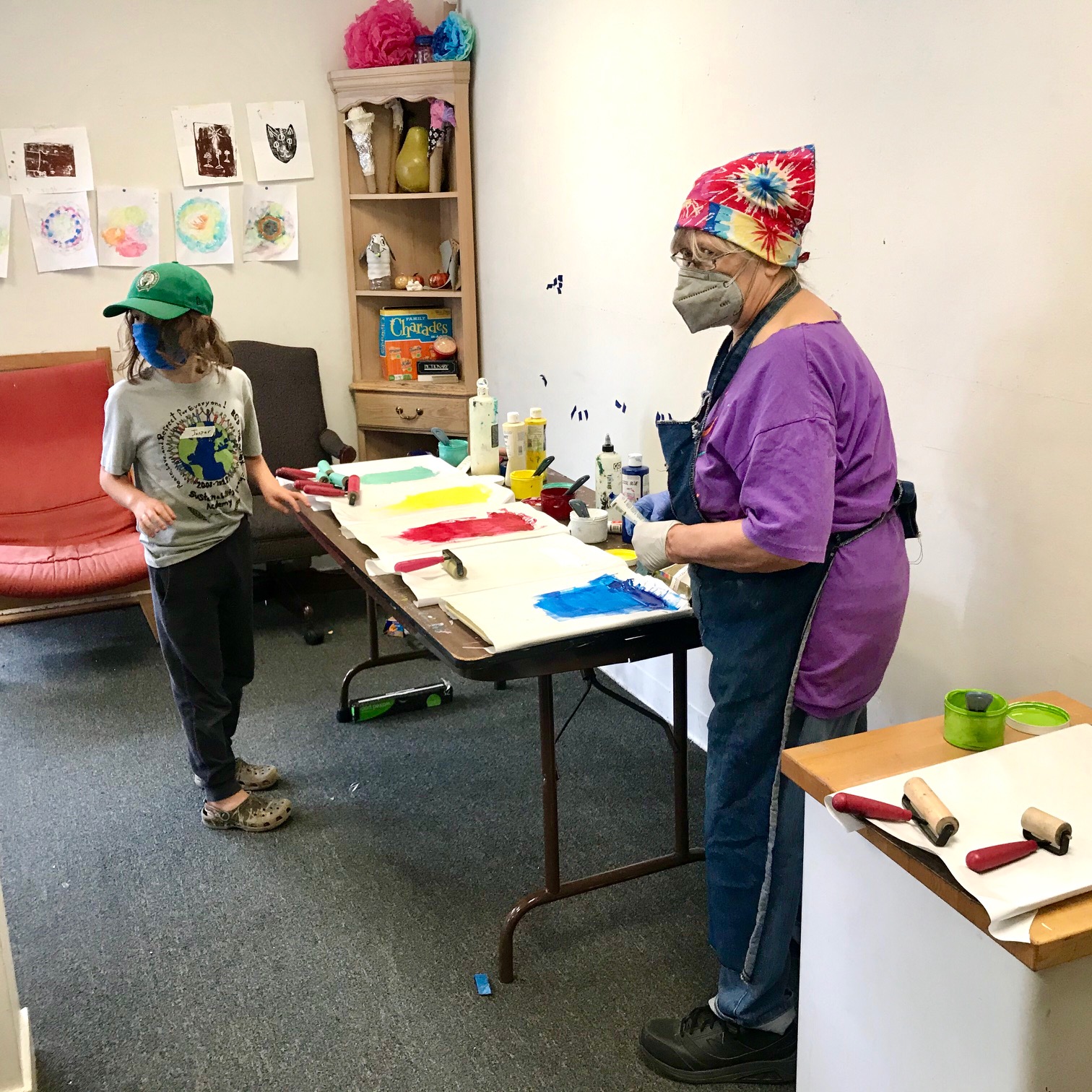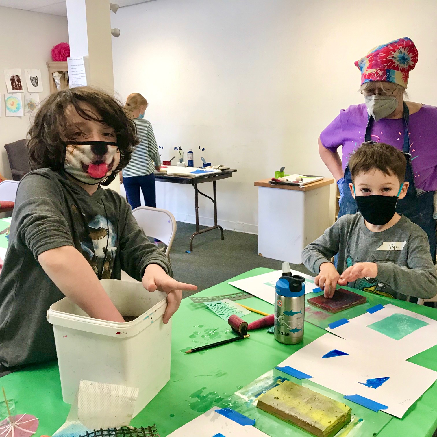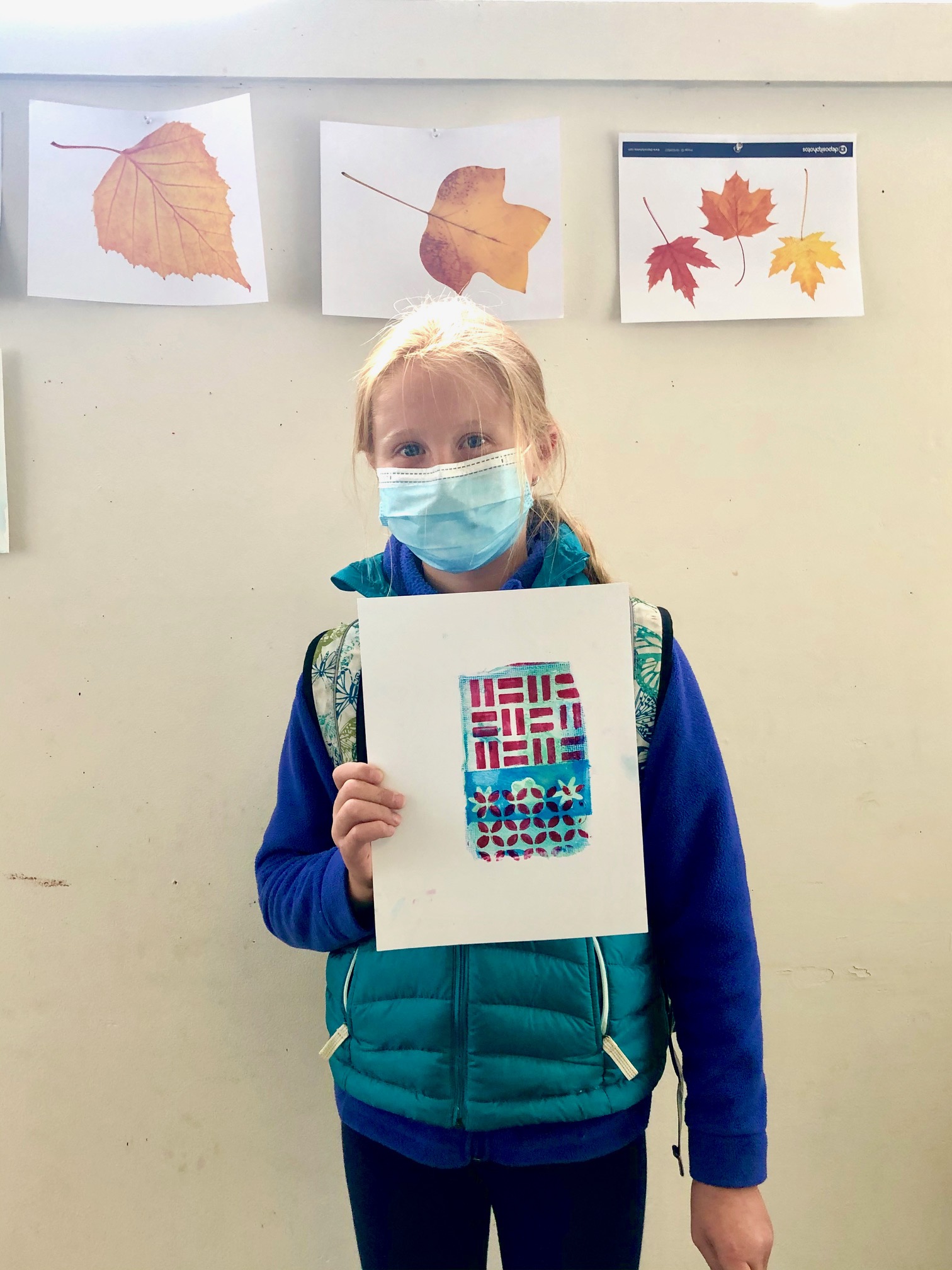 We had such a blast printmaking with guest artist Lyna Lou Nordstrom last Wednesday! We used a printing plate made from firm set gelatin. The process is pure aesthetic play: inking, adding different marks or textures, printing, wiping the plate clean and adding more to layer up the prints. We used some inks that were somewhat transparent so that the colors would mix when printing on top. SO MUCH FUN!