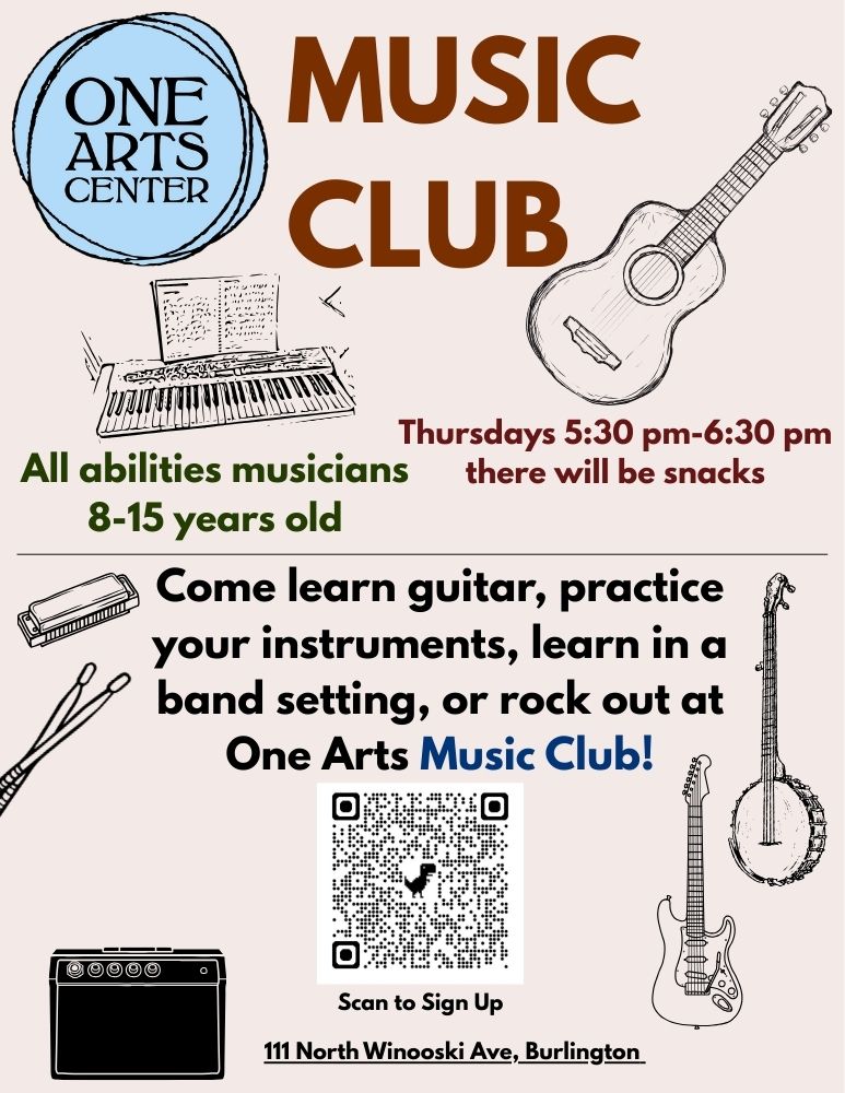 The One Arts Music Club is a chance for inspired young musicians to practice and learn their instruments at any level. It is an opportunity to learn in a low-stakes band environment with our art teachers who are musicians. The goal is to create a community of kids who want to play music! This will include integrated guitar, banjo, and ukulele lessons in combination with any other instruments kids want to practice. Bring the instrument of your choice!